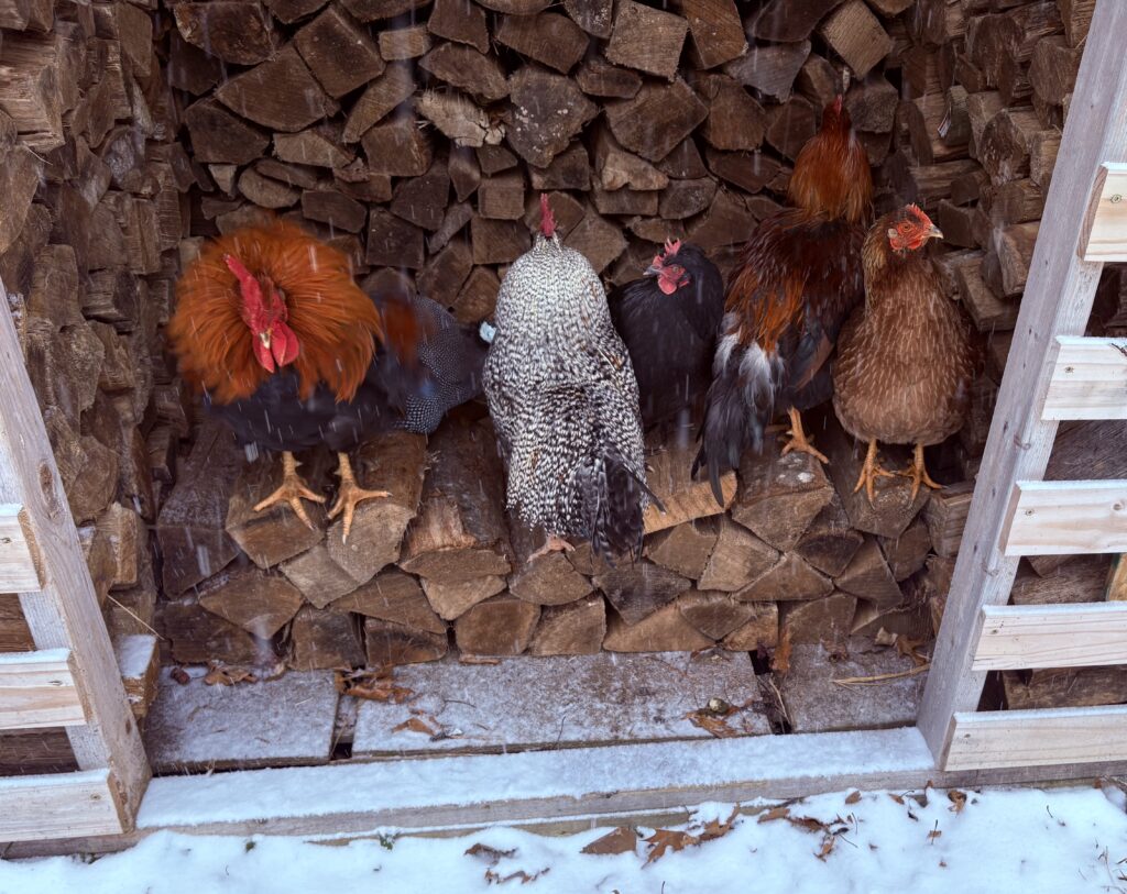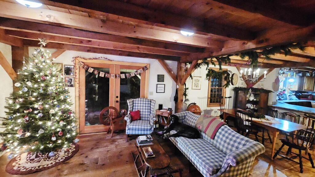 A hitch that smells of cold apple blossoms has attacked the farm. It is holding up the finishing touches on our plans for Christmas decor. Depriving us of the ability to fully get in the spirit of the up coming holiday. Snow, swirls in the air. It insulates us from what little sound finds it’s way to us here from the town road. We hear very little of it anyway as we are set so far from it. The forest to goes quiet. The tree branches get blanketed in white as does the ground beneath our feet. The goats. hang out in their shed. The chickens, take up residence in the woodshed and watch the falling white drifting it’s way to the ground distastefully. Even Pikku, the dog looks at it and seems to groan. I on the other hand get excited. Winter in New England, has arrived. The world is silent and beautiful.